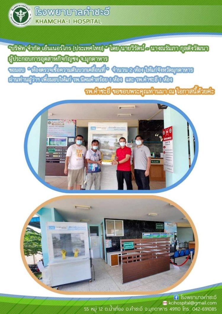 บริษัท เอ็นเนอร์โกร (ประเทศไทย) จำกัด มอบห้องตรวจเชื้อความดันบวกเคลื่อนที่(Positive Pressure SWAB Cabinet) จำนวน 2 ห้อง ให้จังหวัดมุกดาหารใช้สำหรับเก็บสิ่งส่งตรวจ (SWAB) โดยไม่ต้องสัมผัสผู้ป่วยโดยตรง มูลค่ากว่า 2แสนบาท และ มอบเงินสนับสนุน โรงครัวรวมใจ สู้ภัยโควิด ให้เหล่ากาชาดจังหวัดมุกดาหารอีก 1 แสนบาท