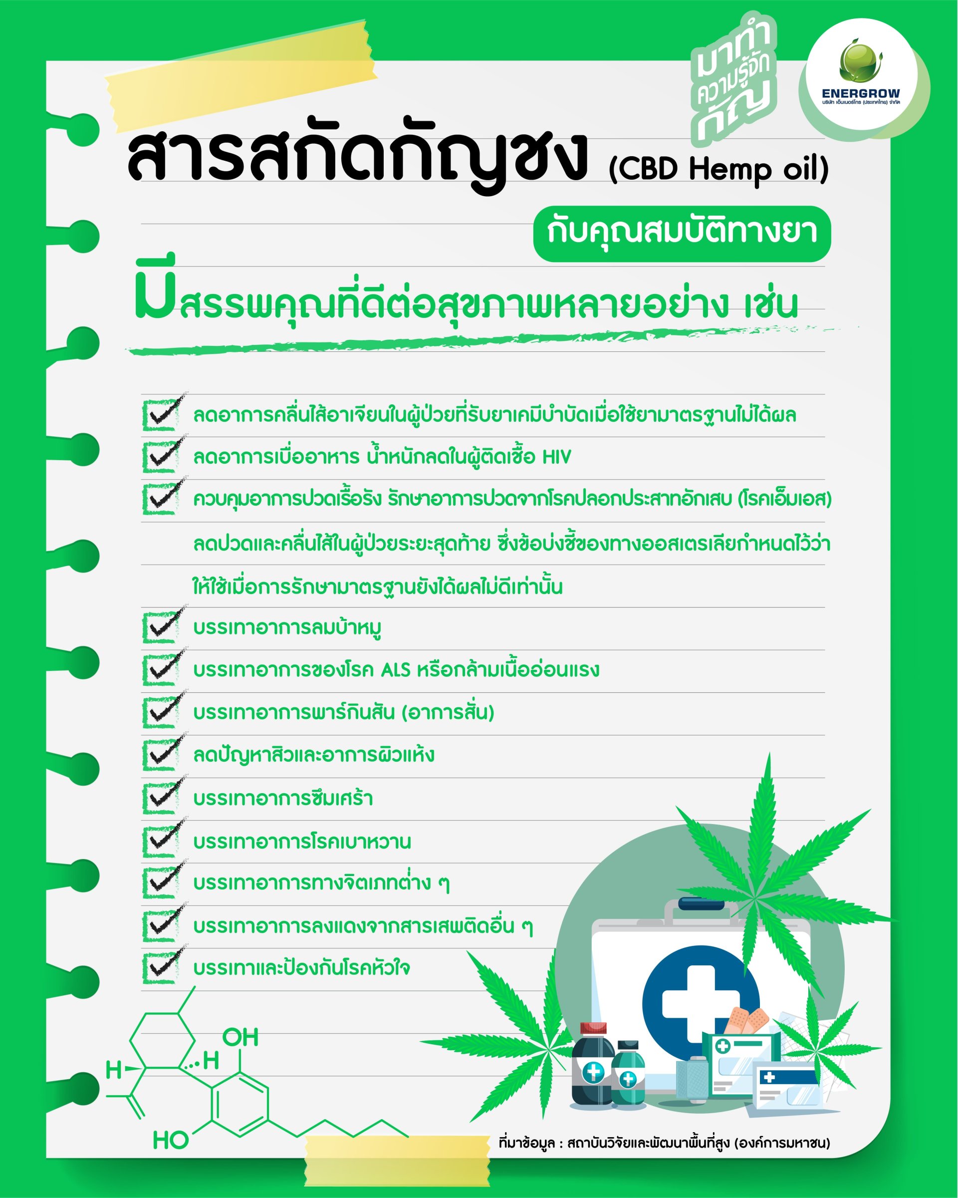 CBD มีกลไกการออกฤทธิ์ทำให้สามารถลดอาการปวด อาการอักเสบ ลดความกังวล และควบคุมอาการชักได้ โดยไม่มีความเป็นพิษต่อระบบประสาท CBD สามารถช่วยลดอาการอักเสบในร่างกาย ลดการอุดตันของเส้นเลือดที่ไปหล่อเลี้ยงหัวใจ และยังช่วยรักษาโรคหลอดเลือดและหัวใจ การศึกษาเกี่ยวกับโรคต่าง ๆ ที่สามารถรักษาด้วย CBD พบว่า CBD มีสรรพคุณที่ดีต่อสุขภาพหลายอย่าง เช่น